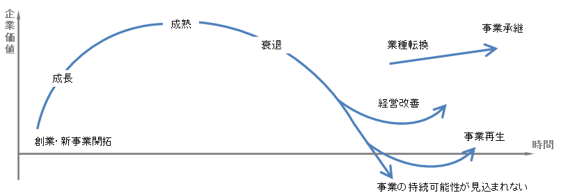 企業が取り組む事業が毀損し、市場(利害関係者)から受け入れられなくなった場合は「業種転換」、企業あるいは事業を営む経営者が交代することによって、企業あるいは事業をより持続させることを「事業承継」といいます。